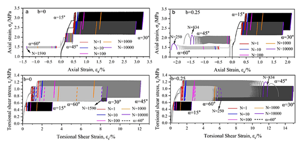 基于上述科学问题,凯发k8西北生态环境资源研究院科研团队采用冻土空心圆柱设备模拟主应力偏转角、中主应力系数和大主应力幅值恒定的循环应力状态(图1),系统研究了-6℃条件下三维应力参数(主应力偏转角和中主应力系数)对冻结青藏粉质粘土变形行为(图2)、应力应变特征(图3)、损伤演化发展规律及疲劳破坏特性的影响。研究结果表明,三维应力参数对冻土的变形行为具有极为显著地影响,并对冻土的疲劳破坏进程具有明显的加速作用(图4)。传统的冻土动力学研究方法所获取的测试结果往往会高估复杂三维应力状态下的冻土抵抗变形和疲劳破坏的能力。该研究成果有助于提升对高路堤边坡下的冻土地基、冻土基坑、边坡,以及在地下工程施工中遇到的人工冻结体等处于复杂三维应力状态下的冻土在地震及车辆等荷载扰动下稳定性的认识。